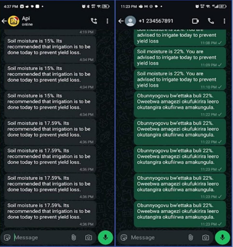 Through the ThingSpeak cloud, the system sends personalized irrigation advice straight to farmers’ phones via SMS or WhatsApp, communicating the state of their crops in both the English and Luganda language. Even if the user does not have a smartphone, a basic mobile can receive the irrigation alerts.
